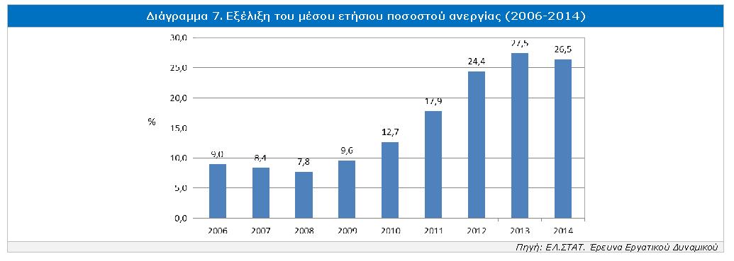 Το μέσο ετήσιο ποσοστό ανεργίας μειώθηκε σε 26,5% το 2014 (έναντι ποσοστού 27,5% το 2013), γεγονός που καταγράφεται για πρώτη φορά μετά το 2008. Στο Δ΄ τρίμηνο του 2014 το ποσοστό ανεργίας διαμορφώθηκε σε 26,1%, μειωμένο κατά 1,7 ποσοστιαία μονάδα σε ετήσια βάση (από 27,8% το Δ΄ τρίμηνο του 2013).