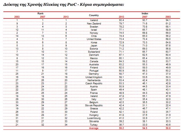 Ο John Hawksworth, Επικεφαλής Οικονομολόγος της PwC και ένας από τους συντάκτες της έκθεσης, αναφέρει: «Δεδομένης της γήρανσης των πληθυσμών του ανεπτυγμένου κόσμου, είναι σημαντικό οι χώρες να αξιοποιούν καλύτερα τους μεγαλύτερους σε ηλικία εργαζόμενους με στόχο την ενίσχυση της οικονομίας και τη χρηματοδότηση των κρατικών δαπανών συνταξιοδότησης και ιατροφαρμακευτικής περίθαλψης. Ο Δείκτης της Χρυσής Ηλικίας που δημιουργήσαμε αναδεικνύει τις χώρες που πρωτοπορούν σε αυτόν τον τομέα, συμπεριλαμβανομένων και της Σκανδιναβίας, της Νέας Ζηλανδίας και του Ισραήλ. Το Ηνωμένο Βασίλειο βρίσκεται μόλις στη μέση της κατάταξης, ενώ οι περισσότερες χώρες της Ευρωζώνης, με εξαίρεση τη Φινλανδία και τη Γερμανία, βρίσκονται αρκετά πίσω. Εκτιμούμε ότι η υιοθέτηση των πολιτικών και των επιχειρηματικών πρακτικών που εφαρμόζουν οι χώρες που βρίσκονται στην κορυφή της κατάταξης, όπως είναι η Σουηδία, θα μπορούσαν να ενισχύσουν το βρετανικό ΑΕΠ κατά περίπου 5% ποσοστιαίες μονάδες σε μακροπρόθεσμο ορίζοντα, με τα οφέλη να είναι ενδεχομένως ακόμη μεγαλύτερα για τις χώρες που βρίσκονται ακόμη χαμηλότερα στην κατάταξη».
