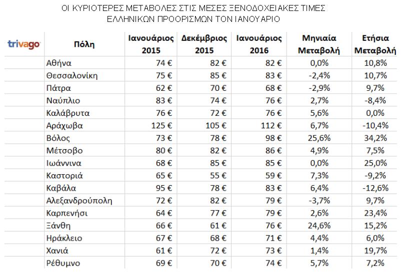 Οι περισσότερες πόλεις φαίνεται να έχουν αυξήσει τις ξενοδοχειακές τιμές τους, συγκριτικά με τον προηγούμενο χρόνο, μεταξύ των οποίων συγκαταλέγονται η Αθήνα, η Θεσσαλονίκη και η Πάτρα.
