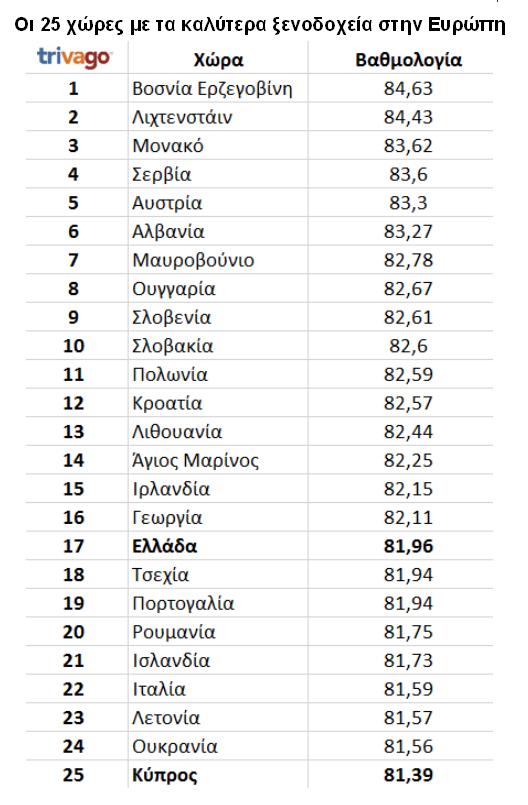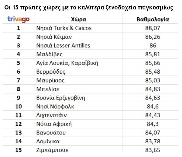Η Ελλάδα όμως περιλαμβάνεται και στην αντίστοιχη παγκόσμια λίστα. Ειδικότερα, με βάση τα στοιχεία της trivago.gr, στη λίστα με τις 100 χώρες με τα καλύτερα ξενοδοχεία παγκοσμίως.