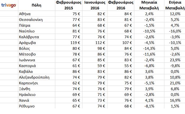 Τον μήνα Φεβρουάριο, η μέση τιμή των ξενοδοχείων της Ελλάδας διαμορφώθηκε στα 90 ευρώ, παραμένοντας απόλυτα σταθερή συγκριτικά με τον Ιανουάριο, αλλά έχοντας μια αύξηση 14 τοις εκατό σε ετήσια βάση, σύμφωνα με έρευνα της Trivago.