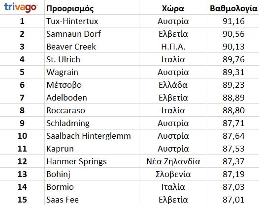 Την πλειοψηφία των θέσεων, όπως ήταν αναμενόμενο, έχουν καταλάβει αυστριακοί και ελβετικοί προορισμοί. Αξιοσημείωτη, όμως, είναι και η ύπαρξη αρκετών ελληνικών προορισμών μεταξύ των 50 δημοφιλέστερων χειμερινών, οι οποίοι είναι ιδανικοί για σκι. Η κατάταξη περιέχει προορισμούς που είτε διαθέτουν χιονοδρομικό κέντρο, είτε βρίσκονται σε απόσταση αναπνοής από ένα.