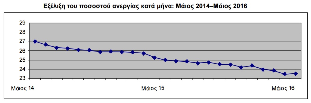 Το εποχικά διορθωμένο ποσοστό ανεργίας τον Μάιο του 2016 ανήλθε σε 23,5%, όσο ακριβώς ήταν και τον Απρίλιο με βάση τα αναθεωρημένα στοιχεία της Αρχής. Σημειώνεται ότι το αντίστοιχο ποσοστό της ανεργίας τον Μάιο του 2015 είχε διαμορφωθεί στο 25%.