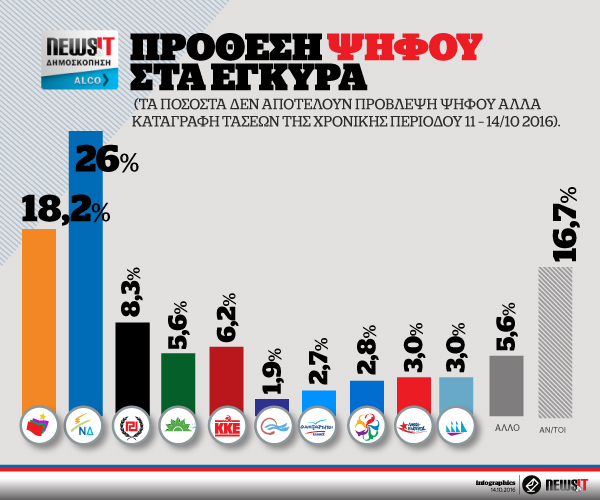 Διεύρυνση της διαφοράς της από τον ΣΥΡΙΖΑ καταγράφει η ΝΔ στην δημοσκόπηση της Αlco για το newsit.gr.