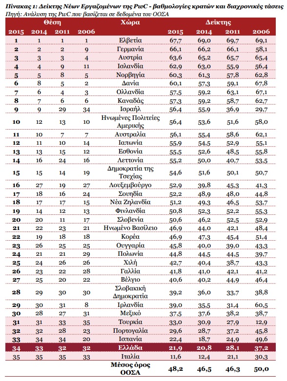 Σε ό,τι αφορά στην κατάταξη των χωρών, οι κεντρικές ευρωπαϊκές οικονομίες της Ελβετίας, της Γερμανίας και της Αυστρίας καταλαμβάνουν και πάλι τις τρεις πρώτες θέσεις του Δείκτη Νέων Εργαζομένων της PwC, ο οποίος συγκρίνει την επίδραση στην αγορά εργασίας και τη συμμετοχή στην εκπαίδευση των ατόμων ηλικίας 15-24 σε χώρες του ΟΟΣΑ για το διάστημα από το 2006.