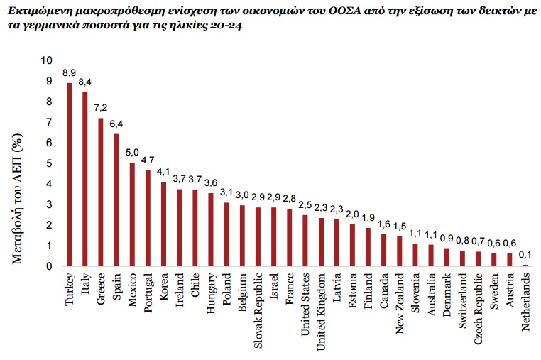 Σημαντικά είναι όμως τα πιθανά οφέλη από τη βελτίωση του δείκτη εξέλιξης των νέων σε ηλικία εργαζομένων και στις υπόλοιπες χώρες του ΟΟΣΑ.