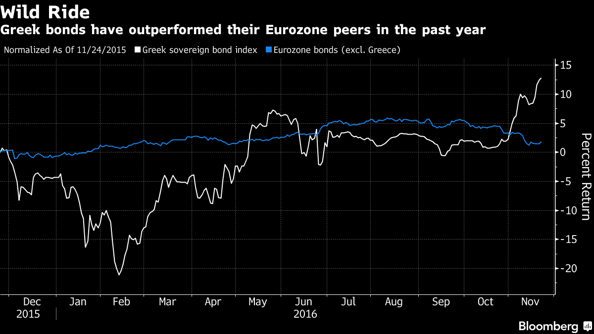 Οι ελληνικές αγορές ενισχύονται τις τελευταίες ημέρες, χάρη στις προσδοκίες πως οι πιστωτές μπορεί επιτέλους να ελαφρύνουν το χρέος που βαραίνει τη χώρα. Τα ελληνικά ομόλογα οδεύουν προς τον καλύτερο μήνα τους από τον Μάρτιο και μετά, ενώ οι μετοχές των τραπεζών έχουν εμφανίσει άνοδο περίπου 30% από τις 15 Νοεμβρίου.