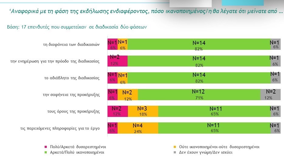 - Το αρχικό στάδιο της υλοποίησης μιας επένδυσης σε συνεργασία με το ΤΑΙΠΕΔ ήταν η εκδήλωση ενδιαφέροντος και οι αρχικές διερευνητικές επαφές για συλλογή πληροφοριών. Στο στάδιο αυτό προκύπτει μεγάλη ικανοποίηση από την κατανόηση των επενδυτικών αναγκών τους από τα στελέχη του ΤΑΙΠΕΔ με θετικό ισοζύγιο ικανοποίησης +83%.