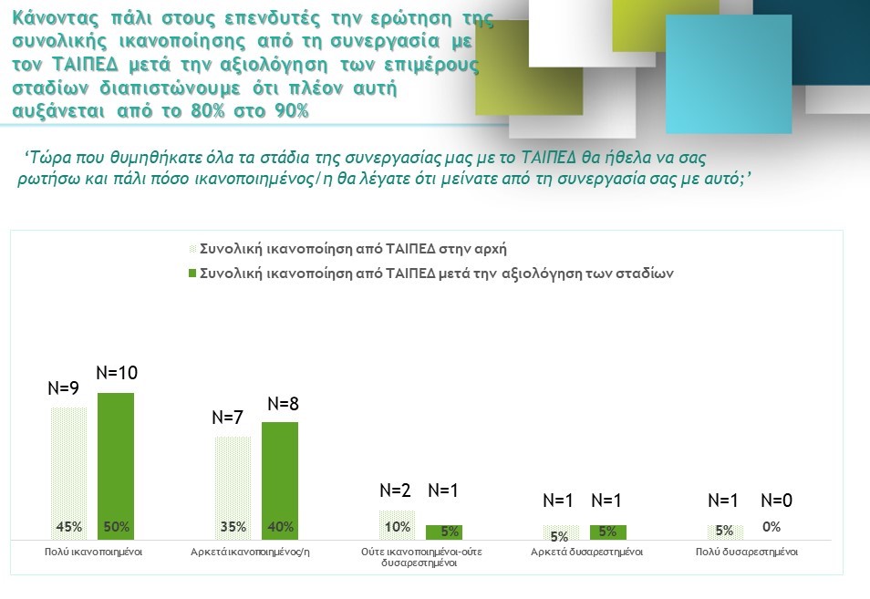 Μετά από την ανάκληση όλης της εμπειρίας της συνεργασίας, ετέθη ξανά η ερώτηση της συνολικής αξιολόγησης του ΤΑΙΠΕΔ. Αυτή τη φορά η συνολική ικανοποίηση ανήλθε στο 90%.