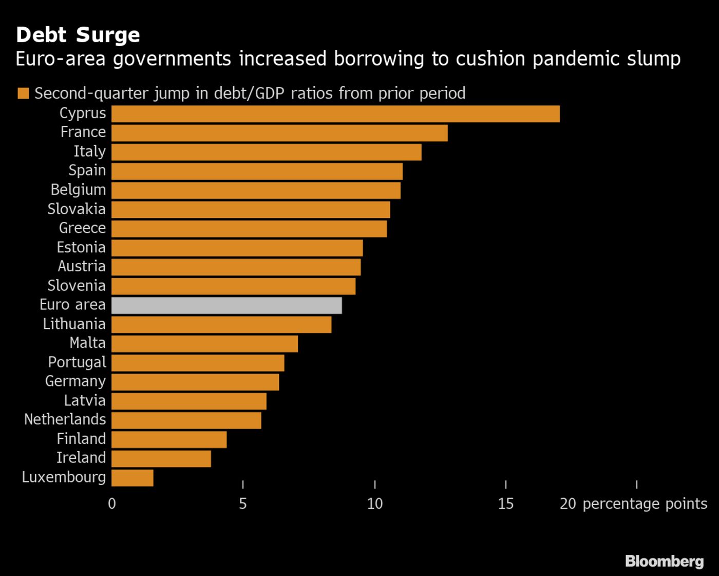 Τέσσερις από τις πέντε χώρες που είχαν ήδη ξεπεράσει το 100% πριν από την πανδημία -Ελλάδα, Ιταλία, Βέλγιο και Γαλλία- σημείωσαν αύξηση πάνω από το μέσο όρο της περιοχής το δεύτερο τρίμηνο.