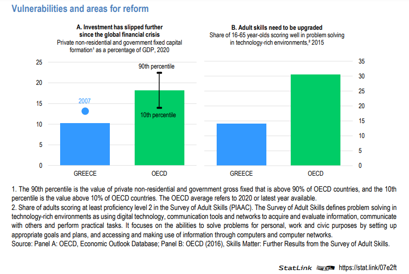 Οι δαπάνες για τις δημόσιες επενδύσεις ήταν μικρότερες σε σχέση με τους στόχους των προϋπολογισμών τα τελευταία χρόνια, υπογραμμίζει. Για να αξιοποιηθούν στο έπακρο τα κονδύλια του EU Next Generation και να διπλασιαστούν οι επενδυτικές δαπάνες, όπως προγραμματίζεται, η ποιότητα και η ταχύτητα της υλοποίησης των δημόσιων επενδύσεων θα πρέπει να βελτιωθούν, τονίζει ο ΟΟΣΑ.