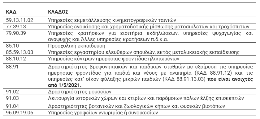 Δυνατότητα υποβολής δηλώσεων αναστολής συμβάσεων εργασίας των εργαζομένων τους με έναρξη από 14/5/2021 θα έχουν οι επιχειρήσεις - εργοδότες σε όλη τη χώρα, που επαναλειτουργούν από 14/5/2021 και πλήττονται και των οποίων η δραστηριότητα είχε ανασταλεί τον μήνα Μάιο και περιλαμβάνεται στους ΚΑΔ του παρακάτω πίνακα.