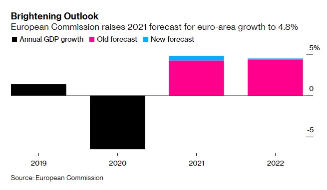 Για την οικονομία της Ευρωζώνης και της ΕΕ, η Ευρωπαϊκή Επιτροπή «βλέπει» ότι θα αναπτυχθούν με τον ίδιο ρυθμό 4,8% το 2021 και 4,5% το 2022. Τόσο για την Ευρωζώνη όσο και για την ΕΕ, η Επιτροπή αναθεώρησε προς τα πάνω τις προβλέψεις της σε σύγκριση με αυτές του Μαΐου.