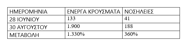 Το 55% του συνόλου των κρουσμάτων του τριμήνου διαγνώστηκαν τον Αύγουστο, ο οποίος έκλεισε με συνολικά 8.509 κρούσματα. Αυτά ήταν κατά 64% αυξημένα σε σχέση με τις 5.200 του Ιουλίου και κατά 375% παραπάνω σε σύγκριση με τα 1.804 του Ιουνίου.