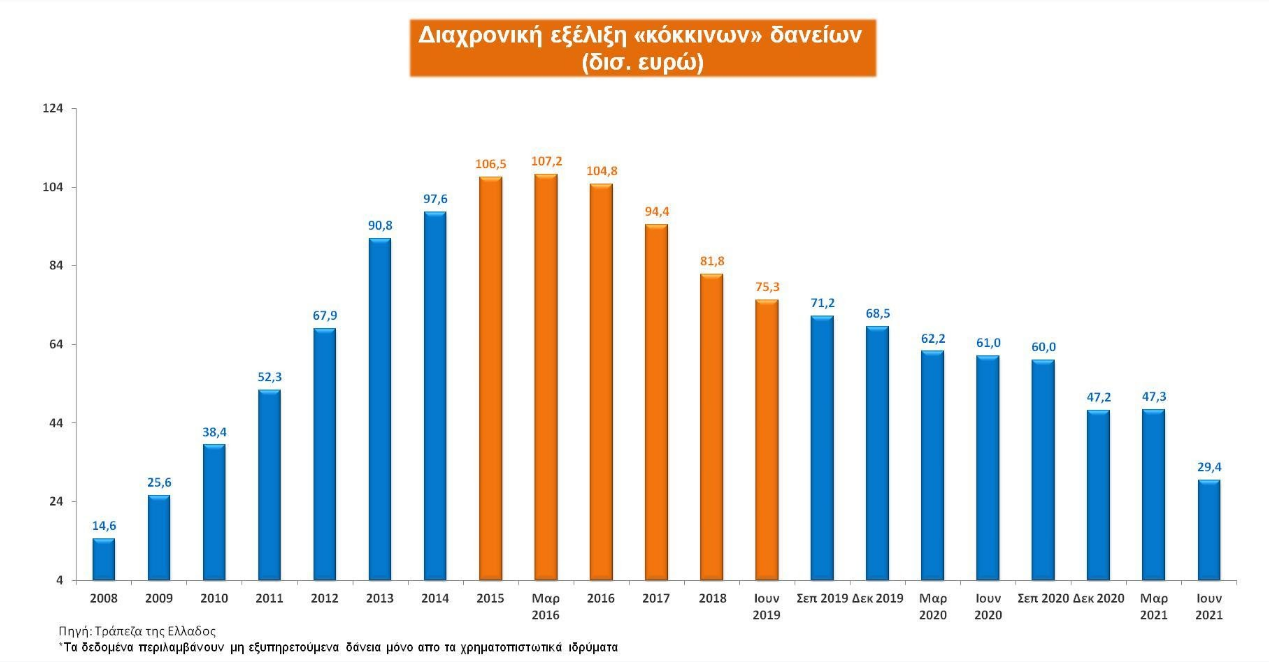 «Σύμφωνα με τα στοιχεία της Τράπεζας της Ελλάδος, τα μη εξυπηρετούμενα δάνεια των ελληνικών τραπεζών ανήλθαν, τον Ιούνιο του 2021, στα 29,4 δισ. ευρώ (20,3% του συνόλου των δανείων), παρουσιάζοντας εντυπωσιακή μείωση την τελευταία διετία. Με την εξέλιξη αυτή, τα «κόκκινα δάνεια» των ελληνικών τραπεζών έχουν υποχωρήσει κατά περίπου 46 δισ. ευρώ από τότε που η Νέα Δημοκρατία ανέλαβε τη διακυβέρνηση της χώρας (ήταν 75,3 δισ. ευρώ τον Ιούνιο του 2019) και κατά περίπου 78 δισ. ευρώ από το υψηλότερο σημείο που είχαν φτάσει, τον Μάρτιο του 2016 (ήταν 107,2 δισ. ευρώ)».