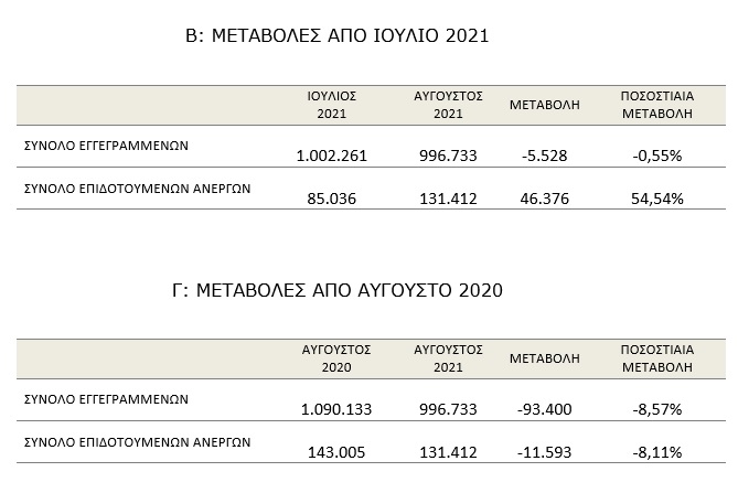Το σύνολο των εγγεγραμμένων ανέργων, με κριτήριο την αναζήτηση εργασίας (αναζητούντων εργασία), για τον Αύγουστο 2021, ανήλθε σε 977.325 άτομα. Από αυτά, 577.344 (ποσοστό 59,07%) είναι εγγεγραμμένα στο μητρώο του ΟΑΕΔ για χρονικό διάστημα ίσο ή και περισσότερο των 12 μηνών και 399.981 (ποσοστό 40,93%) είναι εγγεγραμμένα στο μητρώο του ΟΑΕΔ για χρονικό διάστημα μικρότερο των 12 μηνών. Οι άνδρες ανέρχονται σε 324.128 (ποσοστό 33,16%) και οι γυναίκες ανέρχονται σε 653.197 (ποσοστό 66,84%).