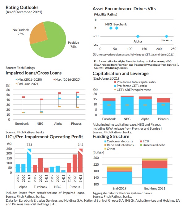 Η μείωση των ζημιών από τα μη εξυπηρετούμενα δάνεια (loan impairment charges), η υγιής ανάπτυξη των εσόδων από προμήθειες και ο περιορισμός του κόστους θα συμβάλουν επίσης θετικά στην παραγωγή κερδών. Οι πιέσεις στα περιθώρια και η μείωση των μη εξυπηρετούμενων δανείων που δεν δίνουν πλέον τόκους θα περιορίσουν τα καθαρά έσοδα από τόκους, ωστόσο η Fitch αναμένει ότι η θα αυξηθεί η χορήγηση νέων δανείων, με στήριξη από τις εκταμιεύσεις από το Ταμείο Ανάκαμψης αλλά και την ισχυρότερη οικονομική κατάσταση των νοικοκυριών.
