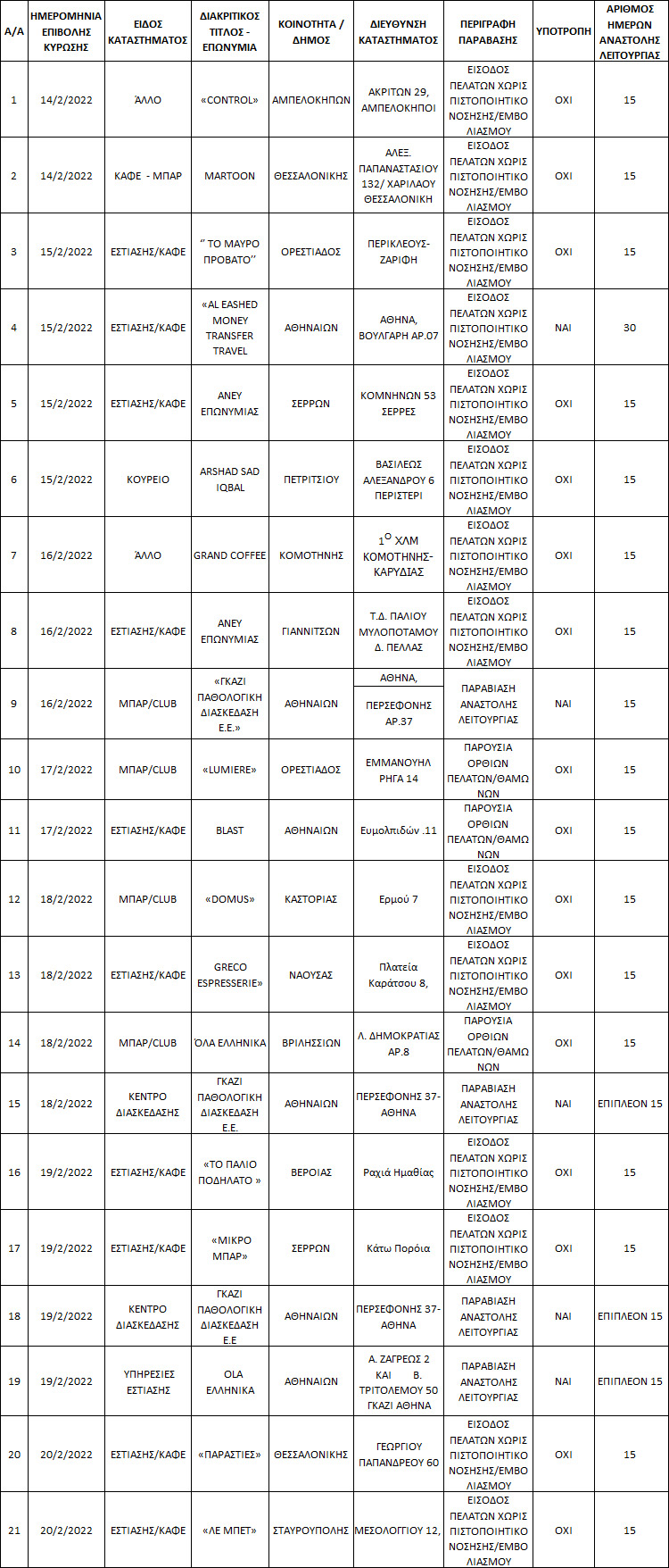 Η Γενική Γραμματεία Εμπορίου και Προστασίας Καταναλωτή του Υπουργείου Ανάπτυξης και Επενδύσεων, δυνάμει των διατάξεων του άρθρου 54 του ν. 4886/2022, δημοσιεύει τις εμπορικές επωνυμίες των επιχειρήσεων στις οποίες έχει επιβληθεί η διοικητική κύρωση της αναστολής λειτουργίας για την παραβίαση των μέτρων κατά της διασποράς του κορωνοϊού COVID-19, από την Ελληνική Αστυνομία, την Εθνική Αρχή Διαφάνειας και τη Διυπηρεσιακή Μονάδα Ελέγχου της Αγοράς (ΔΙΜΕΑ), στο χρονικό διάστημα από 14-02-2022 έως 20-02-2022.