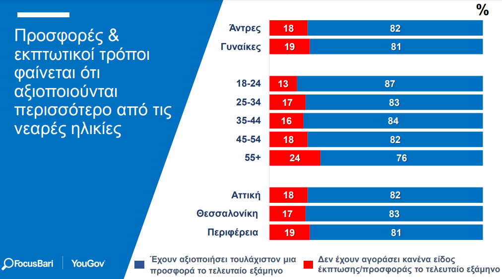 • Αντίστοιχη αναλογία δηλώνουν πως αναζητούν και προτιμούν τα είδη που είναι σε ειδικές προσφορές ή στις χαμηλότερες δυνατές τιμές, και…