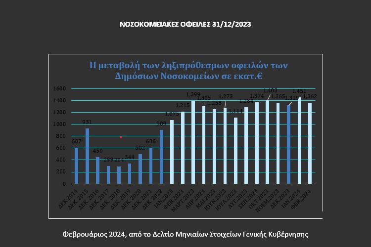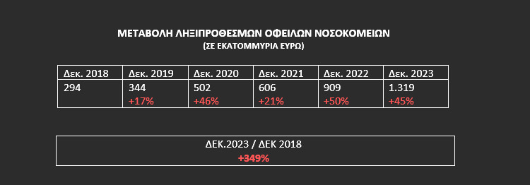 Μέσα στη δεκαετία 2014-2024, τα «φέσια» των νοσοκομείων προς τους παρόχους αυξήθηκαν 124%. Από το 2019 μέχρι το 2023 (πενταετία) εκτοξεύτηκε η αύξηση στο 295%. Το πρώτο φετινό δίμηνο, η κούρσα της ανόδου συνεχίζει ακάθεκτη κατά 3,2%.