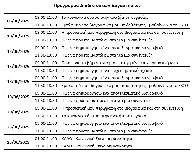 Τα 18 διαδικτυακά e-Εργαστήρια διάρκειας 2 ωρών θα πραγματοποιηθούν από εργασιακούς συμβούλους στις ημερομηνίες του παρακάτω πίνακα.