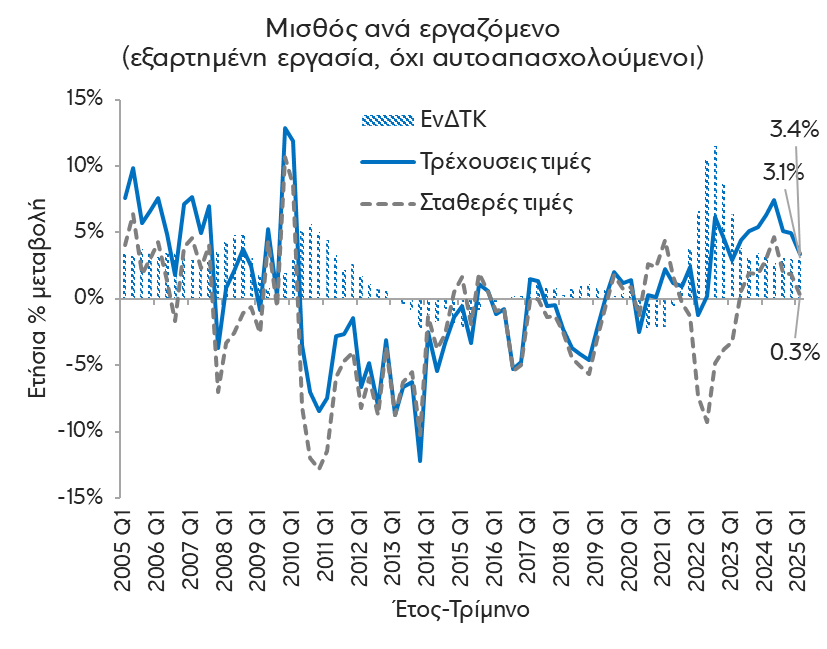 Μισθός ανά εργαζόμενο (εξαρτημένη εργασία, όχι αυτοαπασχολούμενοι) σε τρέχουσες και σταθερές τιμές