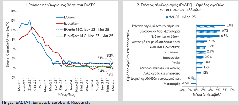Επιπρόσθετα, στην περίπτωση της Ελλάδας, ο σχετικά χαμηλός πληθωρισμός στα αγαθά -αν και αυξήθηκε στο 1,6% τον Μάιο 2025, από μόλις 0,2% τον Απρίλιο 2025- αντισταθμίζεται από τον υψηλό πληθωρισμό στις υπηρεσίες (5,2%). Tο ίδιο συμβαίνει και στην Ευρωζώνη, ωστόσο με ηπιότερο πληθωρισμό τόσο στα αγαθά (0,8% τον Μάιος 2025) όσο και τις υπηρεσίες (3,2%).