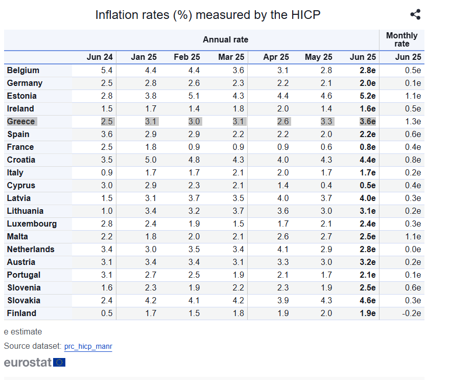 Στο 3,6% ανήλθε ο ετήσιος πληθωρισμός στην Ελλάδα τον Ιούνιο, σύμφωνα με τη Eurostat. Ενα μήνα πριν ήταν στο 3,3%.