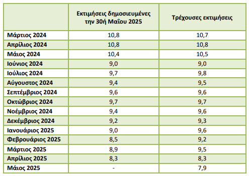 Με την παρούσα ανακοίνωση οι εκτιμήσεις του ποσοστού ανεργίας για την περίοδο Μαρτίου 2024 – Απριλίου 2025 αναθεωρούνται (σε σχέση με τις αντίστοιχες εκτιμήσεις της προηγούμενης ανακοίνωσης) ως εξής: