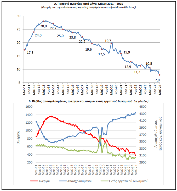 Το εποχικά διορθωμένο ποσοστό ανεργίας τον Μάιο του 2025 ανήλθε σε 7,9%, έναντι 8,3% τον Απρίλιο του 2025 και του αναθεωρημένου προς τα πάνω 10,5% τον Μάιο του 2024.