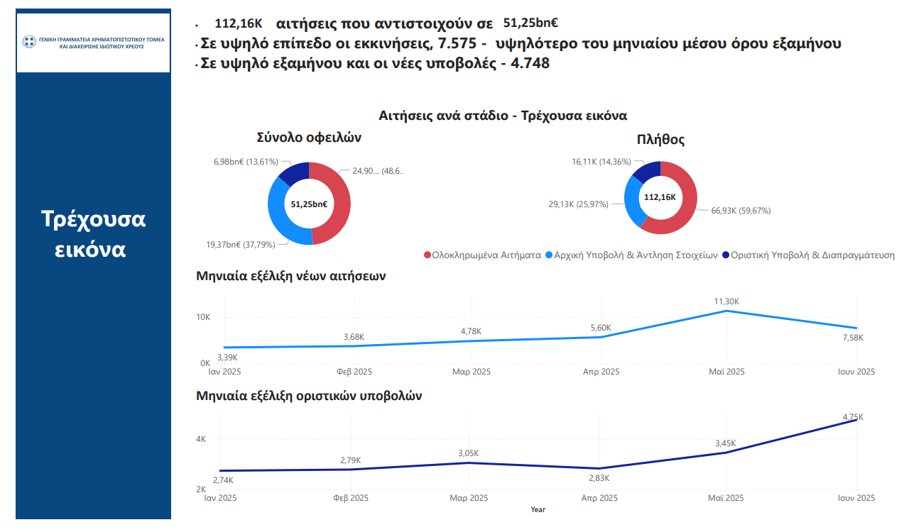 Σύμφωνα με την ανακοίνωση του υπουργείου Εθνικής Οικονομίας και Οικονομικών, τα στοιχεία του Ιουνίου πιστοποιούν για άλλη μια φορά ότι ο διπλασιασμός των εισοδηματικών και περιουσιακών ορίων που εφαρμόζεται από τον Μάιο, μαζί με όλες τις πρόσφατες θεσμοθετημένες βελτιώσεις στο πλαίσιο του Εξωδικαστικού, δίνει βιώσιμες ρυθμίσεις, καλύπτοντας ουσιαστικά τη μεσαία τάξη.