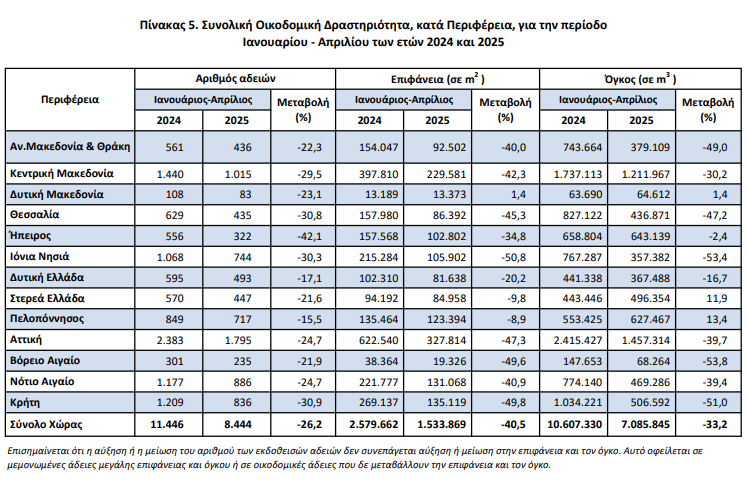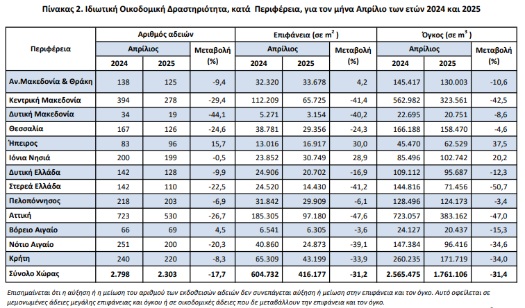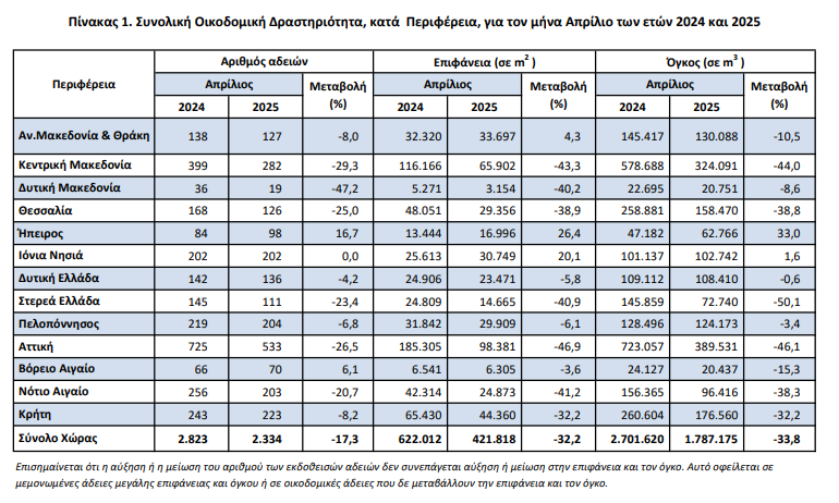 Το μέγεθος της Συνολικής Οικοδομικής Δραστηριότητας (Ιδιωτικής - Δημόσιας), κατά τον μήνα Απρίλιο 2025, στο σύνολο της Χώρας με βάση τις εκδοθείσες οικοδομικές άδειες, ανήλθε σε 2.334 οικοδομικές άδειες, που αντιστοιχούν σε 421.818 m2επιφάνειας και 1.787.175 m3 όγκου, παρουσίασε δηλαδή, μείωση κατά 17,3% στον αριθμό των οικοδομικών αδειών, μείωση κατά 32,2% στην επιφάνεια και μείωση κατά 33,8% στον όγκο, σε σχέση με τον αντίστοιχο μήνα του 2024.