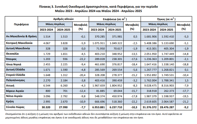 Κατά την περίοδο των τελευταίων δώδεκα μηνών, δηλαδή από τον Μάιο 2024 έως τον Απρίλιο 2025, το μέγεθος της Συνολικής Οικοδομικής Δραστηριότητας (Ιδιωτικής-Δημόσιας) με βάση τις εκδοθείσες οικοδομικές άδειες, στο σύνολο της Χώρας, ανήλθε σε 27.990 οικοδομικές άδειες, που αντιστοιχούν σε 6.237.710 m2 επιφάνειας και 28.476.287 m3 όγκου. Σε σχέση με την αντίστοιχη περίοδο Μαΐου 2023 - Απριλίου 2024 παρατηρήθηκε μείωση κατά 7,7% στον αριθμό των οικοδομικών αδειών, μείωση κατά 10,3% στην επιφάνεια και μείωση κατά 9,2% στον όγκο.