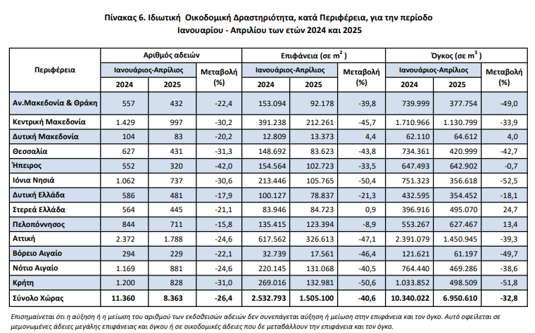 Κατά την ίδια περίοδο Ιανουαρίου - Απριλίου 2025, η Ιδιωτική Οικοδομική Δραστηριότητα, εμφανίζει στο σύνολο της Χώρας, μείωση κατά 26,4% στον αριθμό των οικοδομικών αδειών, μείωση κατά 40,6% στην επιφάνεια και μείωση κατά 32,8% στον όγκο, σε σχέση με την περίοδο Ιανουαρίου -Απριλίου 2024.