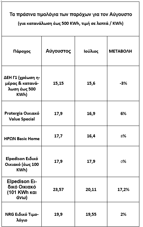 Συγκρίνοντας τις τιμές με τον προηγούμενο μήνα, η μέση πράσινη χρέωση των 18,9 λεπτών της αγοράς ρεύματος για τον Αύγουστο βγάζει μια μονοψήφια αύξηση έναντι του Ιούλη (+6%), ωστόσο παίρνοντας υπόψη τις εταιρείες με τα μεγαλύτερα μερίδια, προκύπτει ότι για οκτώ στους δέκα καταναλωτές, η μέση τιμή βγαίνει χαμηλότερα, στα 16,9 λεπτά.