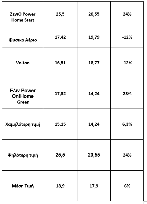 Στη περίπτωση της Protergia, το πράσινο βγαίνει στα 17,9 λεπτά (+6%), του Ηρωνα στα 17,7 λεπτά (+8%), της Elpedison για κατανάλωση από 101 κιλοβατώρες και πάνω στα 23,57 λεπτά (+17,2%) και της NRG στα 19,9 λεπτά (+2%).