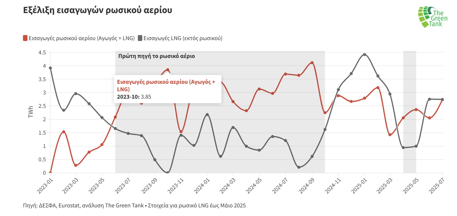 Τις παραπάνω τάσεις, δηλαδή την εξέλιξη των εισαγωγών του ρωσικού αερίου σε συνδυασμό με την εκρηκτική άνοδο των εισαγωγών LNG (κυρίως αμερικανικής προέλευσης), καταγράφει και η χθεσινή ανάλυση του think tank Green Tank, όπως δείχνει και το σχετικό διάγραμμα, για το πρώτο επτάμηνο.