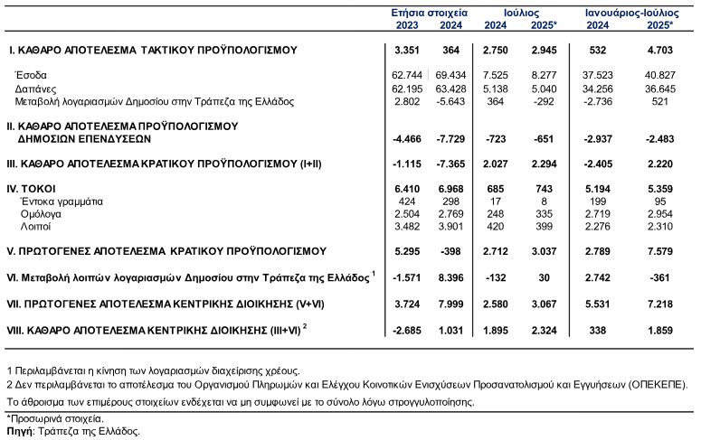 Πλεόνασμα ύψους 1.859 εκατ. ευρώ παρουσίασε το ταμειακό αποτέλεσμα της κεντρικής διοίκησης το διάστημα Ιανουάριος-Ιούλιος 2025, σύμφωνα με τα στοιχεία που δημοσιοποίησε σήμερα Τρίτη (19/8) η Τράπεζα της Ελλάδος. Την αντίστοιχη περίοδο ένα χρόνο νωρίτερα, είχε καταγραφεί πλεόνασμα ύψους 338 εκατ. ευρώ.