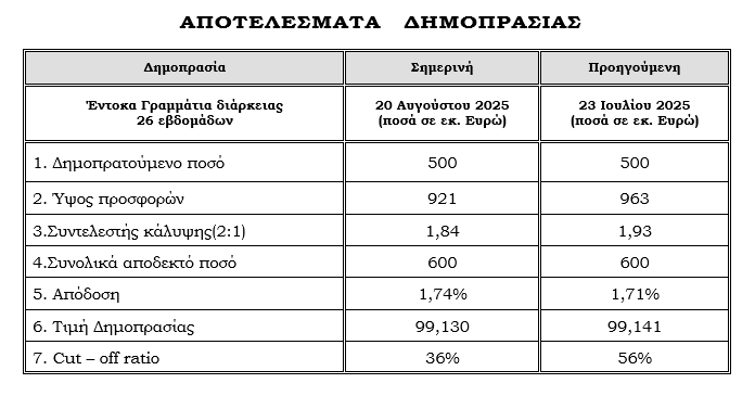 Η δημοπρασία πραγματοποιήθηκε μέσω των Βασικών Διαπραγματευτών Αγοράς (Primary Dealers), και η ημερομηνία διακανονισμού είναι η Παρασκευή 22 Αυγούστου 2025.