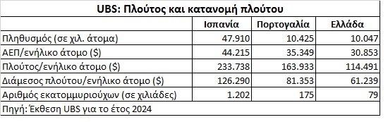 Για παράδειγμα, σύμφωνα με τον παρατιθέμενο πίνακα (πηγή UBS) η Ελλάδα υστερεί στον κατά κεφαλή πλούτο σε σύγκριση με την Ισπανία και την Πορτογαλία. Σύμφωνα με τον ίδιο οίκο, πάντως, o πλούτος της χώρας μας αυξήθηκε το 2024 κατά 7% σε σύγκριση με την προηγούμενη χρονιά, όταν το ποσοστό αυτό ήταν 4,6% παγκοσμίως. Με άλλα λόγια, η Ελλάδα κινήθηκε αρκετά καλύτερα από το μέσο όρο.