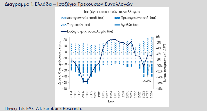 Αυτό σημαίνει ότι οι εισπράξεις των φορέων της ελληνικής οικονομίας, ήτοι των νοικοκυριών, των επιχειρήσεων και της κυβέρνησης, από συναλλαγές με φορείς της αλλοδαπής, για αγαθά, υπηρεσίες, εισοδήματα και τρέχουσες μεταβιβάσεις, υπολείπονταν των αντίστοιχων πληρωμών κατά αυτό το ποσό, επισημαίνει η Eurobank στο τελευταίο της οικονομικό δελτίο «7 Ημέρες Οικονομία».
