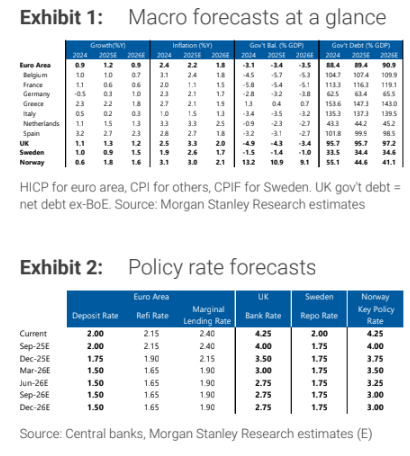 Η Morgan Stanley υπογραμμίζει ότι η Ελλάδα βρίσκεται σε καλύτερη θέση από τον μέσο όρο της Ευρωζώνης, με συνδυασμό θετικής ανάπτυξης, αποκλιμάκωσης χρέους και ελεγχόμενου πληθωρισμού. Ωστόσο, οι εξωτερικές πιέσεις -όπως η διεθνής εμπορική αβεβαιότητα και η ισχυροποίηση του ευρώ- ενδέχεται να επηρεάσουν την εξαγωγική δυναμική.
