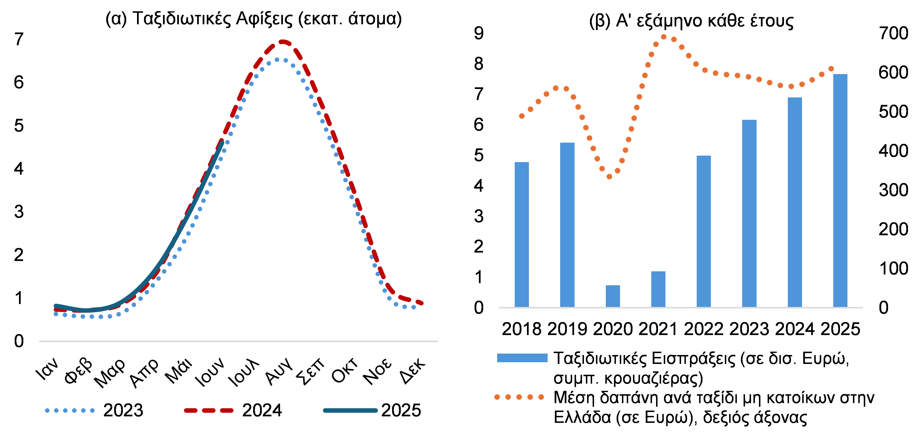 Ταξιδιωτικές εισπράξεις και αφίξεις βάσει προέλευσης, πρώτο εξάμηνο 2025