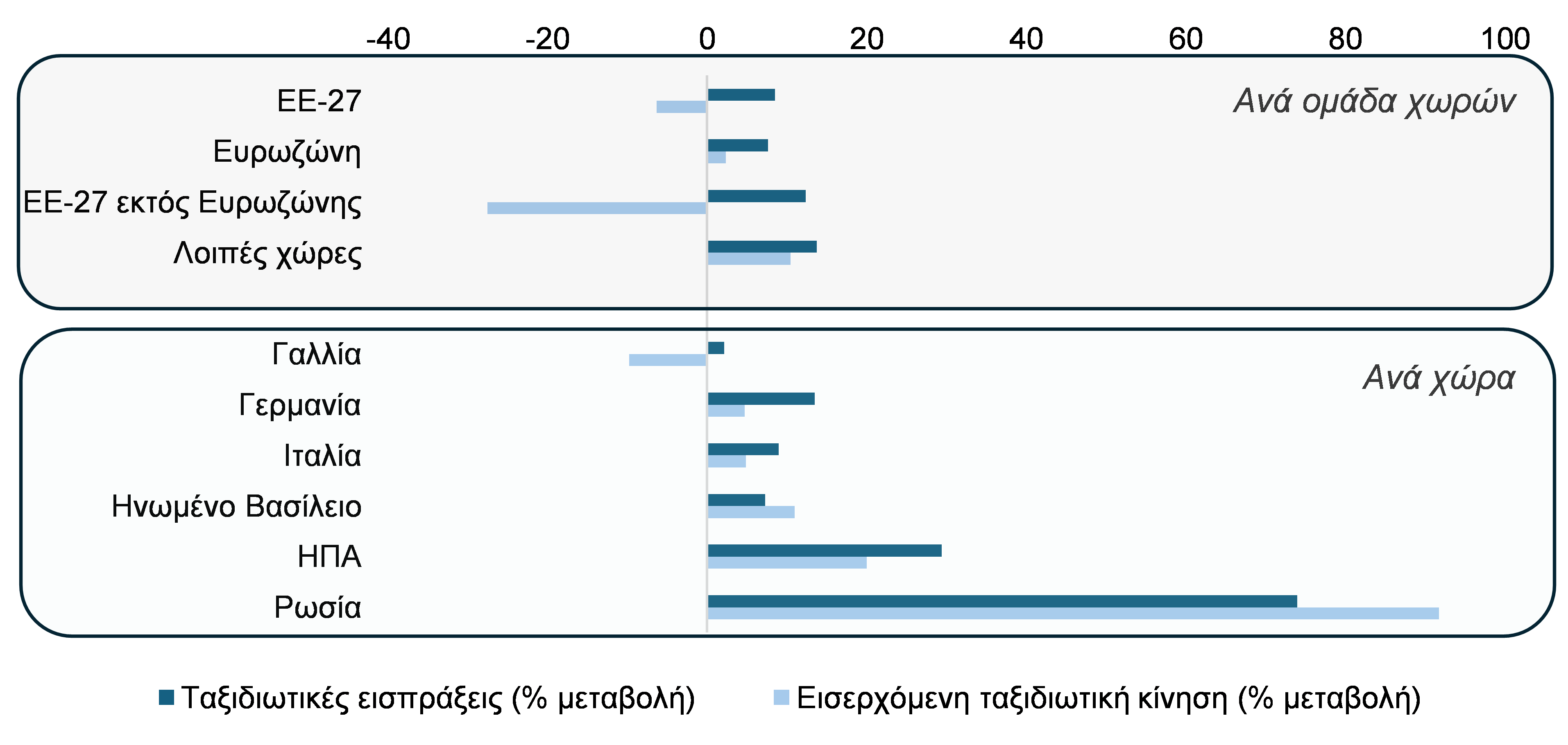 Στην περίπτωση της Ρωσίας, η μεταβολή αυτή παρουσιάζει ιδιαίτερο ενδιαφέρον, δεδομένου ότι οι ροές εισερχόμενου τουρισμού είχαν περιοριστεί από το 2022 και για την επόμενη διετία, λόγω του πολέμου στην Ουκρανία. Αντίθετα, αν και οι εισπράξεις από τη Γαλλία -η οποία επίσης αποτελεί μία από τις σημαντικότερες αγορές για τον ελληνικό τουρισμό- αυξήθηκαν κατά 2,1% σε ετήσια βάση, οι αντίστοιχες αφίξεις κατέγραψαν σημαντική πτώση, ύψους σχεδόν 10%, σε σύγκριση με το πρώτο εξάμηνο του 2024.