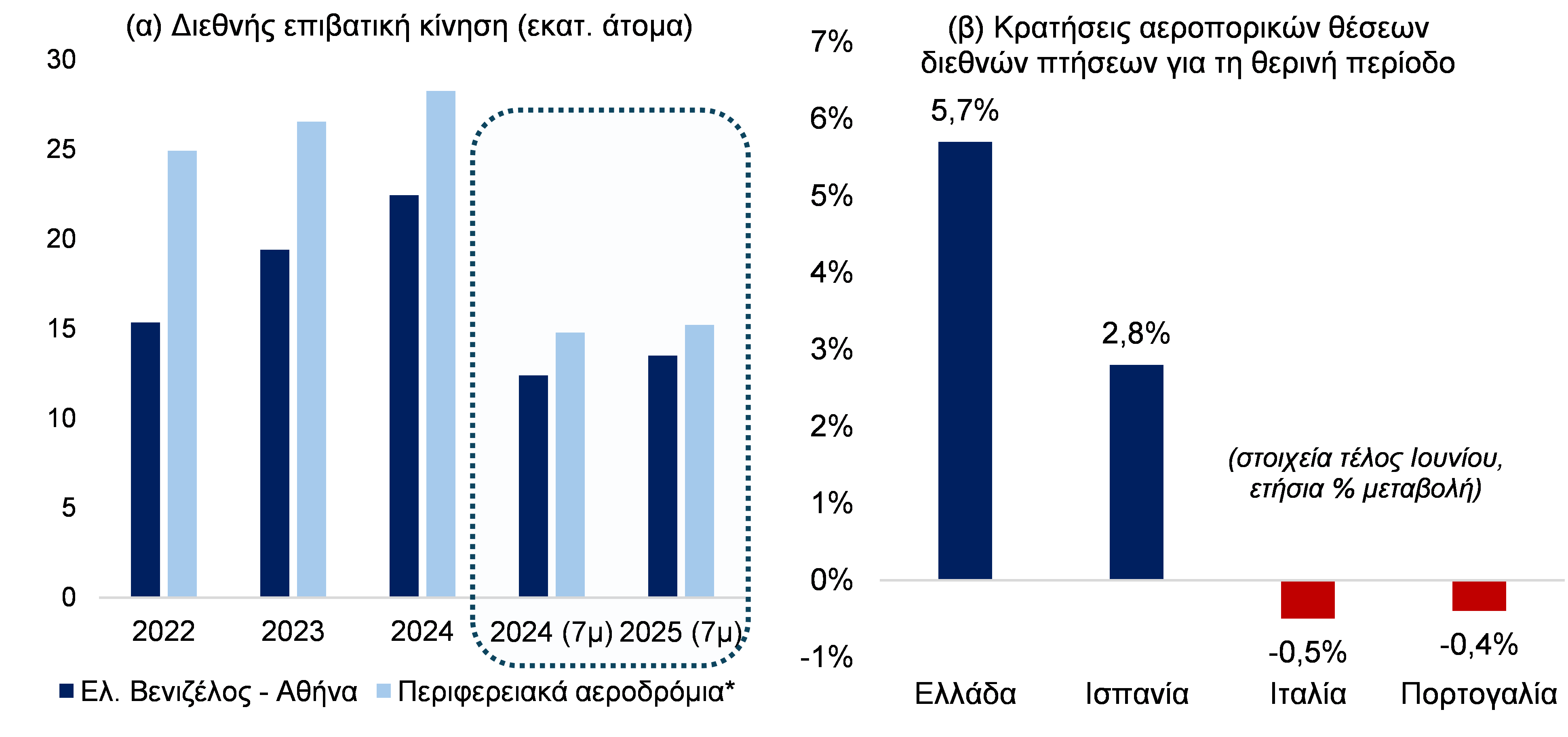 Οι ενδείξεις για τις επιδόσεις του ελληνικού τουρισμού τους υπόλοιπους καλοκαιρινούς μήνες είναι θετικές. Η επιβατική κίνηση στο αεροδρόμιο της Αθήνας αλλά και στα περιφερειακά αεροδρόμια της χώρας[i] παραμένει σε ανοδική τροχιά. Αναλυτικά, οι διεθνείς αφίξεις στο αεροδρόμιο της Αθήνας, οι οποίες ξεπέρασαν τα 22 εκατ. το 2024, ανήλθαν τους πρώτους επτά μήνες του 2025 σε 13,5 εκατ., αυξημένες κατά περισσότερο από 1 εκατ. σε σύγκριση με το ίδιο διάστημα του 2024. Ομοίως, στα περιφερειακά αεροδρόμια της χώρας από την αρχή του έτους έως το τέλος Ιουλίου οι διεθνείς επιβάτες ήταν κατά περίπου 3% περισσότεροι από το αντίστοιχο διάστημα πέρυσι. Τον Ιούλιο συγκεκριμένα, η διεθνής επιβατική κίνηση στο αεροδρόμιο της Αθήνας κατέγραψε ετήσια άνοδο ύψους 5,4%, ενώ αντίστοιχα στα περιφερειακά αεροδρόμια 2,9%.