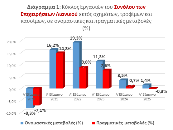 · Ο κύκλος εργασιών υποχώρησε κατά 14,0% ή -2,0 δισ. ευρώ μέσα σε ένα μόνο εξάμηνο. Ωστόσο, επισημαίνεται πως η εν λόγω αρνητική εξέλιξη αποδίδεται τόσο στην επίδραση της έντονης εποχικότητας της οικονομικής δραστηριότητας όσο και στο μη ευνοϊκό διεθνές οικονομικό και επιχειρηματικό περιβάλλον (ανησυχία για τη δασμολογική πολιτική ΗΠΑ, διεθνής ανασφάλεια/αβεβαιότητα των αγορών, περιορισμός καταναλωτικής δαπάνης, αύξηση κόστους προμήθειας προϊόντων & πρώτων υλών).