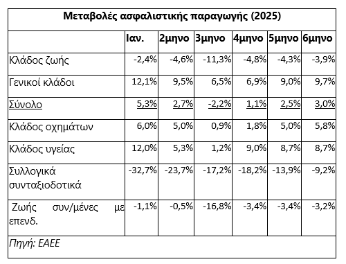 Χαμηλότερα σε σχέση με τις αρχικές προσδοκίες κινήθηκε κατά το πρώτο φετινό εξάμηνο η εγχώρια ασφαλιστική παραγωγή, καθώς έτρεξε με μόλις 3%, παρά το ότι επιβλήθηκαν αξιοσημείωτες αυξήσεις τιμολογίων στους γενικούς κλάδους και κόντρα στο γεγονός ότι η αγορά περίμενε τις ευνοϊκές επιδράσεις από τα μέτρα που ανακοίνωσε η κυβέρνηση το φθινόπωρο του 2024.