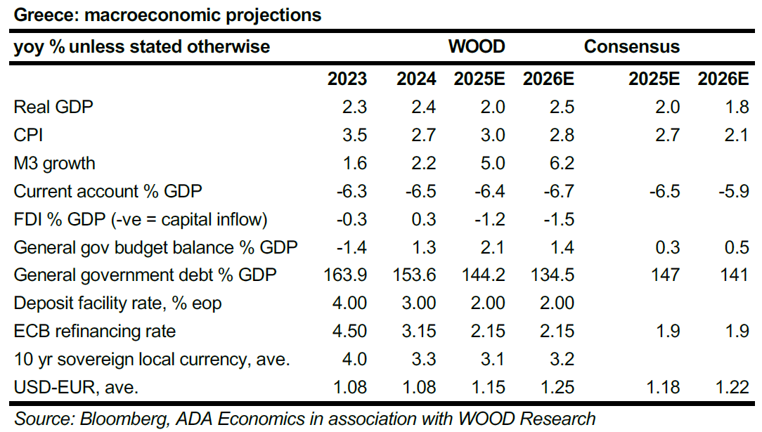 Η Wood προβλέπει ότι η Ελλάδα θα παραμείνει σε τροχιά πρωτογενών πλεονασμάτων άνω του 2% του ΑΕΠ, εξασφαλίζοντας χώρο για περαιτέρω μειώσεις του χρέους και πιθανές νέες αναβαθμίσεις από τους οίκους αξιολόγησης.