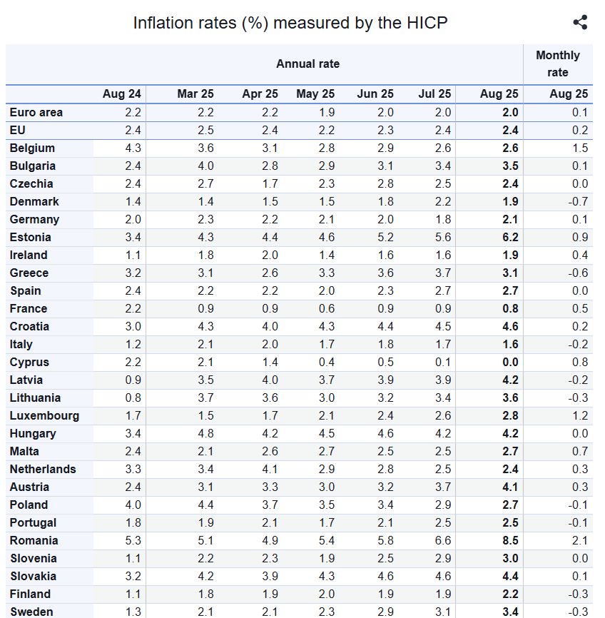 Ο ετήσιος πληθωρισμός στην Ευρωπαϊκή Ένωση διαμορφώθηκε στο 2,4% τον Αύγουστο, επίσης σταθερός σε σύγκριση με τον Ιούλιο και ίδιος με τον Αύγουστο του 2024, σύμφωνα με τη δεύτερη εκτίμηση της Eurostat.