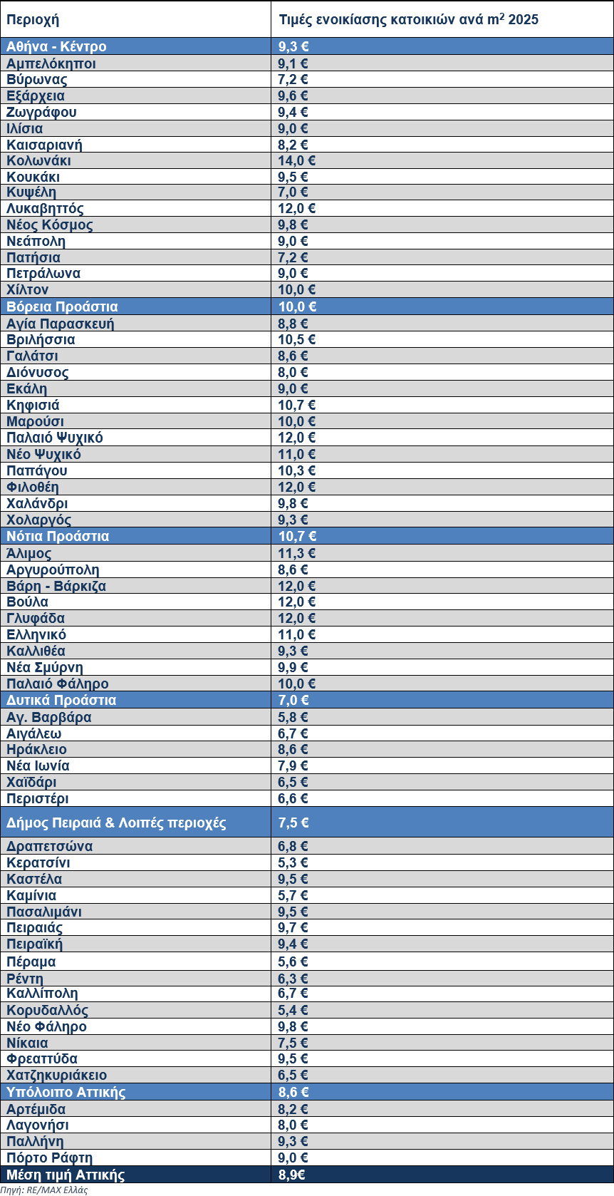 Αυξήσεις στις τιμές κατά μέσο όρο 4,3% παρουσιάζουν το 2025, σύμφωνα με την RE/MAX Ελλάς, τα ενοίκια κατοικιών σε ολόκληρη την επικράτεια, σε σύγκριση με το 2024. Η τάση αυτή συνδέεται με την αυξημένη ζήτηση για κατοικίες -και ιδιαιτέρως για ποιοτικά ακίνητα- σε συνδυασμό με την περιορισμένη διαθεσιμότητά τους. Πρωταθλητές ανόδου είναι τα ακίνητα που βρίσκονται στην Περιφέρεια, ενώ σε Αττική και Θεσσαλονίκη καταγράφονται ήπιες αυξητικές τάσεις.